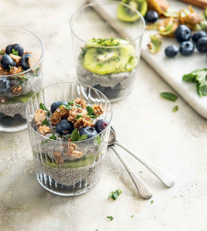 - Toss the sliced kiwi with the lime juice and shredded mint, and add a layer to the glasses. Spoon over the rest of the chia mixture.
