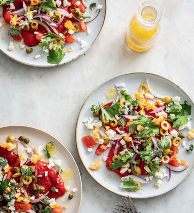 A simple yet elegant salad where sweet roasted red peppers are paired with hard-boiled eggs, capers, and olives, all brought together with a zesty lemon vinaigrette.