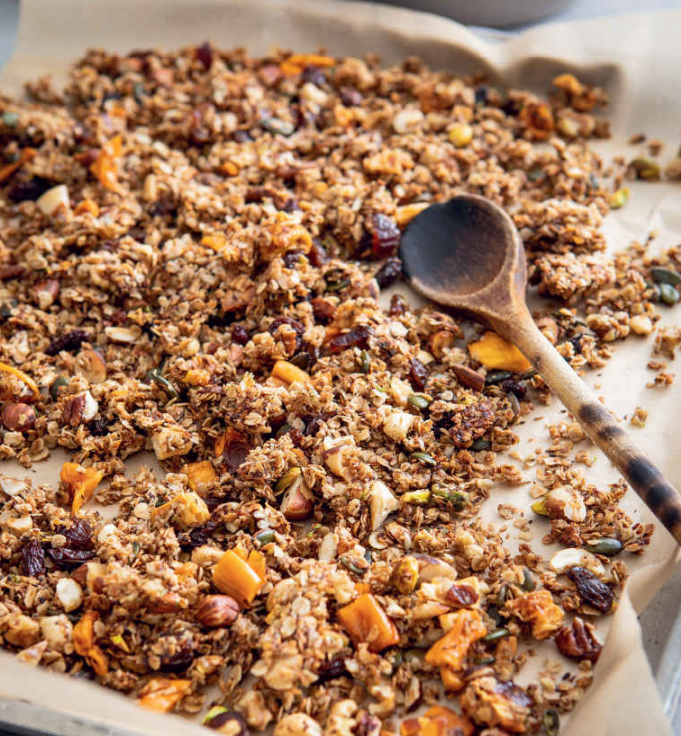 - Tip the granola onto a baking tray lined with parchment paper and spread it out to cool and crisp up. Store in an airtight container.