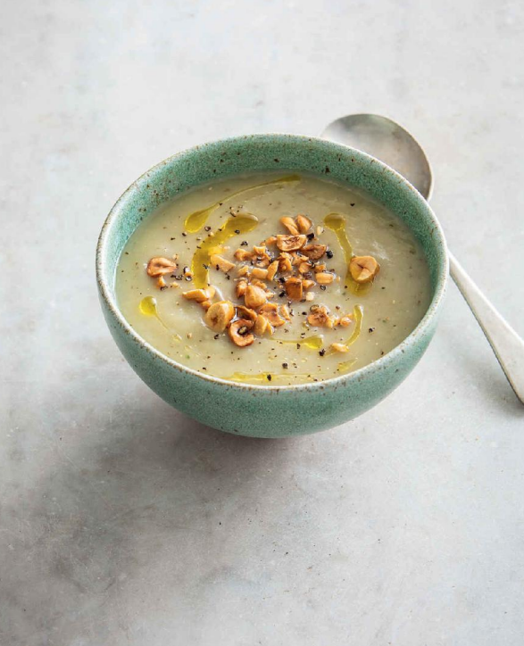 This wonderfully smooth and earthy soup is packed with gut-friendly Jerusalem artichokes and sweet leeks. The toasted hazelnuts on top add a perfect crunch.