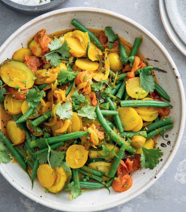- Curry: 1 tbsp olive oil, a few curry leaves (optional), 1 large onion (sliced), 400g new potatoes (sliced), 3 garlic cloves (finely chopped), 15g root ginger (grated), 1 tbsp curry powder, 1 tbsp tamarind paste, 400g cherry tomatoes, 400g green beans (trimmed and halved), 2 courgettes (sliced on the diagonal), squeeze of lemon or lime juice.