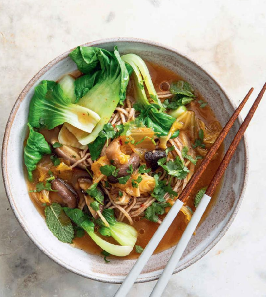 - Broth: 15g dried shiitake mushrooms, 2 tbsp white miso paste, 1.5 litres vegetable stock, 15g root ginger (cut into matchsticks), 3 garlic cloves (finely sliced), 2 tbsp soy sauce.
