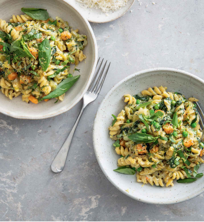 - Pasta: 2 tbsp olive oil, 1 onion (finely chopped), 1 celery stick (finely diced), 100g squash (peeled and finely diced), 1 large courgette (coarsely grated), 2 garlic cloves (finely chopped), 1 tsp dried oregano, zest of 1 lemon, 100g frozen spinach (defrosted), 100g frozen peas, 250g short pasta (like fusilli), up to 700ml vegetable stock.