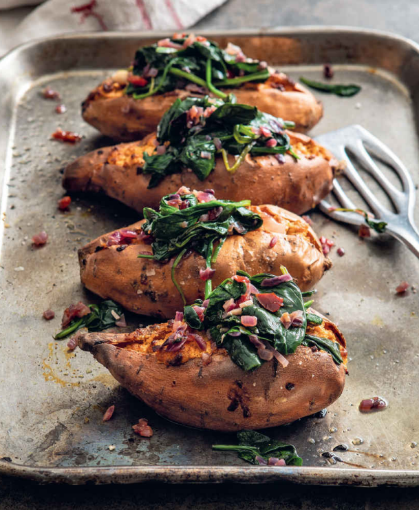 - Pile the spinach mixture on top of the stuffed sweet potatoes and serve immediately.