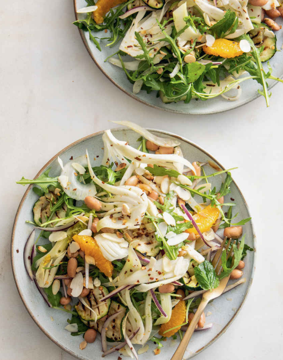 - Arrange the rocket on a serving dish. Sprinkle over the beans, fennel, grilled courgettes, and sliced red onion. Top with the orange segments.