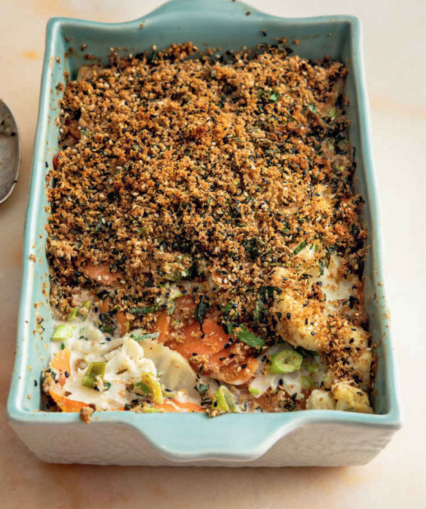 A comforting and hearty vegan bake where thinly sliced root vegetables are baked in a creamy coconut and peanut sauce, all finished with a crunchy breadcrumb topping.