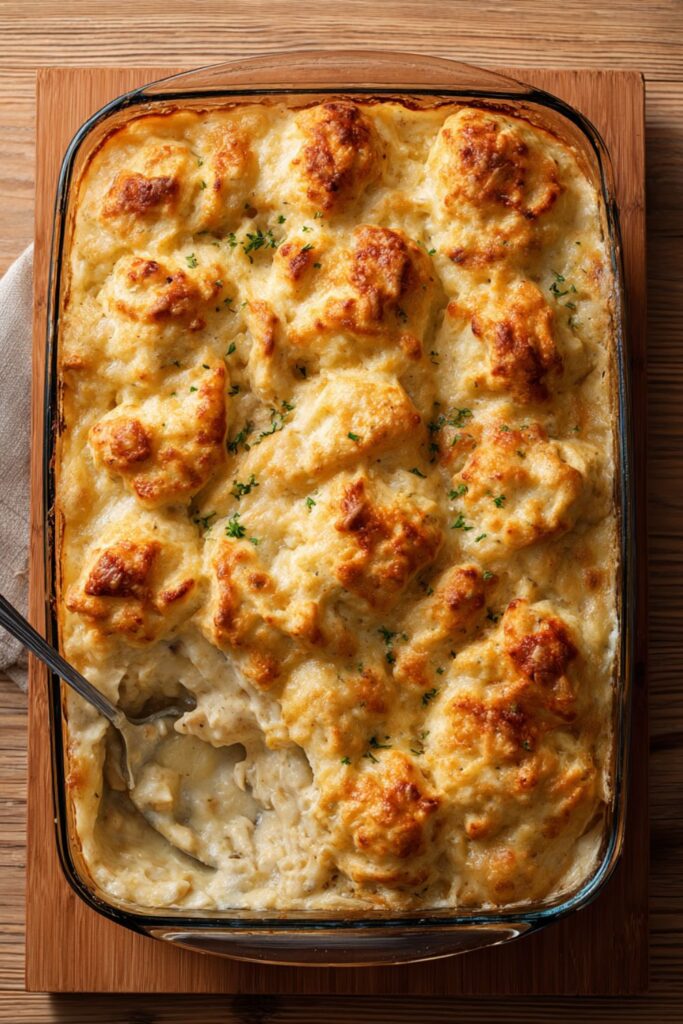 An easy, comforting, and creamy casserole with tender chicken and a fluffy dumpling topping that magically makes itself.