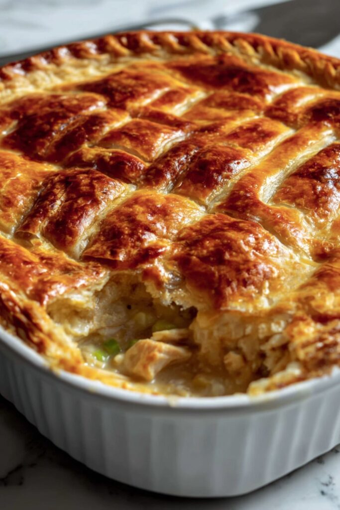 A classic and comforting pie with tender chicken and soft leeks in a creamy thyme-infused sauce, all topped with a golden, flaky puff pastry lid.