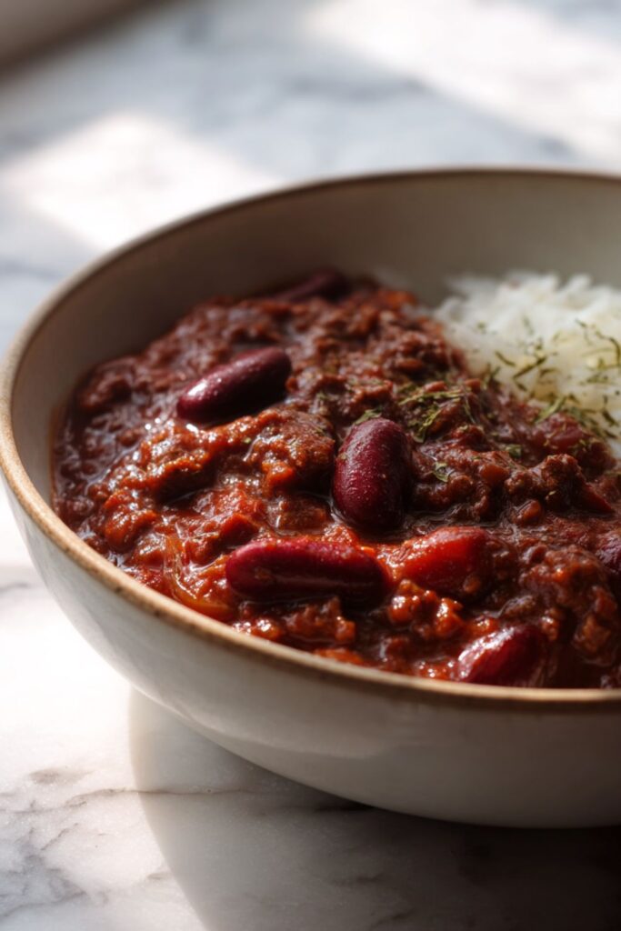 A rich, hearty, and deeply flavorful chilli con carne with tender minced beef and kidney beans, all simmered in a savory, spiced tomato and red wine sauce.