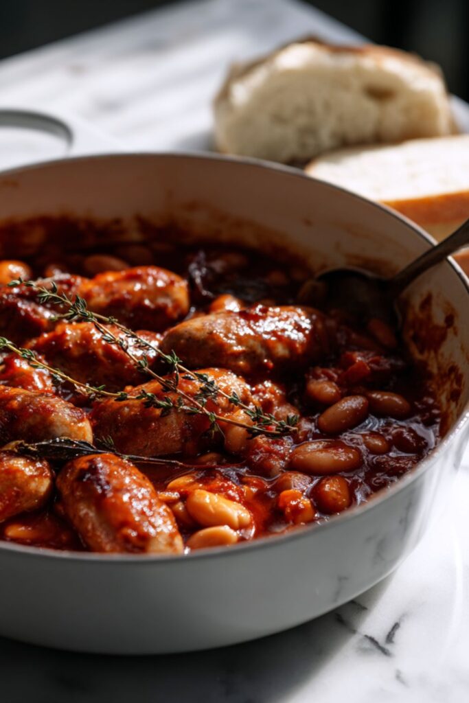 A rich and hearty one-pot casserole with browned sausages, crispy bacon, and beans all simmered in a deep, savory tomato and herb sauce.