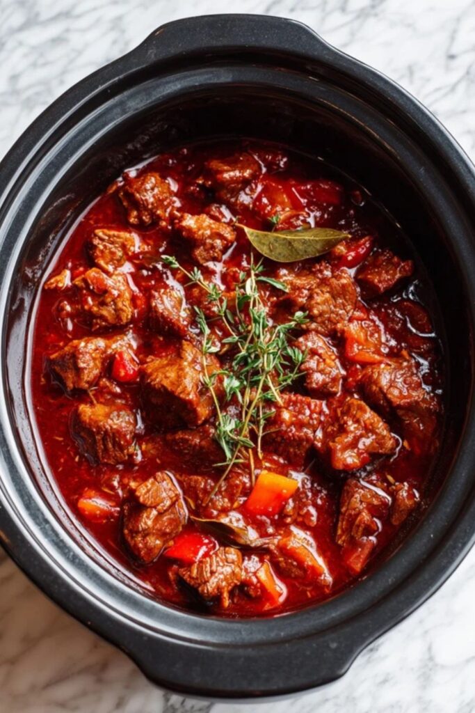- How do I thicken the goulash? The flour used to coat the pork and the long cooking time should naturally thicken the sauce. If it’s still too thin for your liking, you can remove the lid and cook on HIGH for the last 30 minutes to help it reduce.