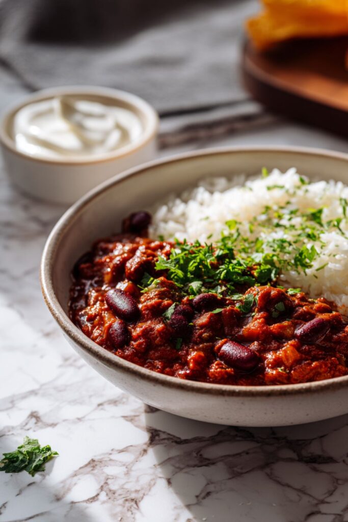 - Serve: Once the chilli is reduced, glossy, and rich, it’s ready. Serve hot over cooked rice, topped with a dollop of vegan sour cream and a sprinkle of fresh coriander.